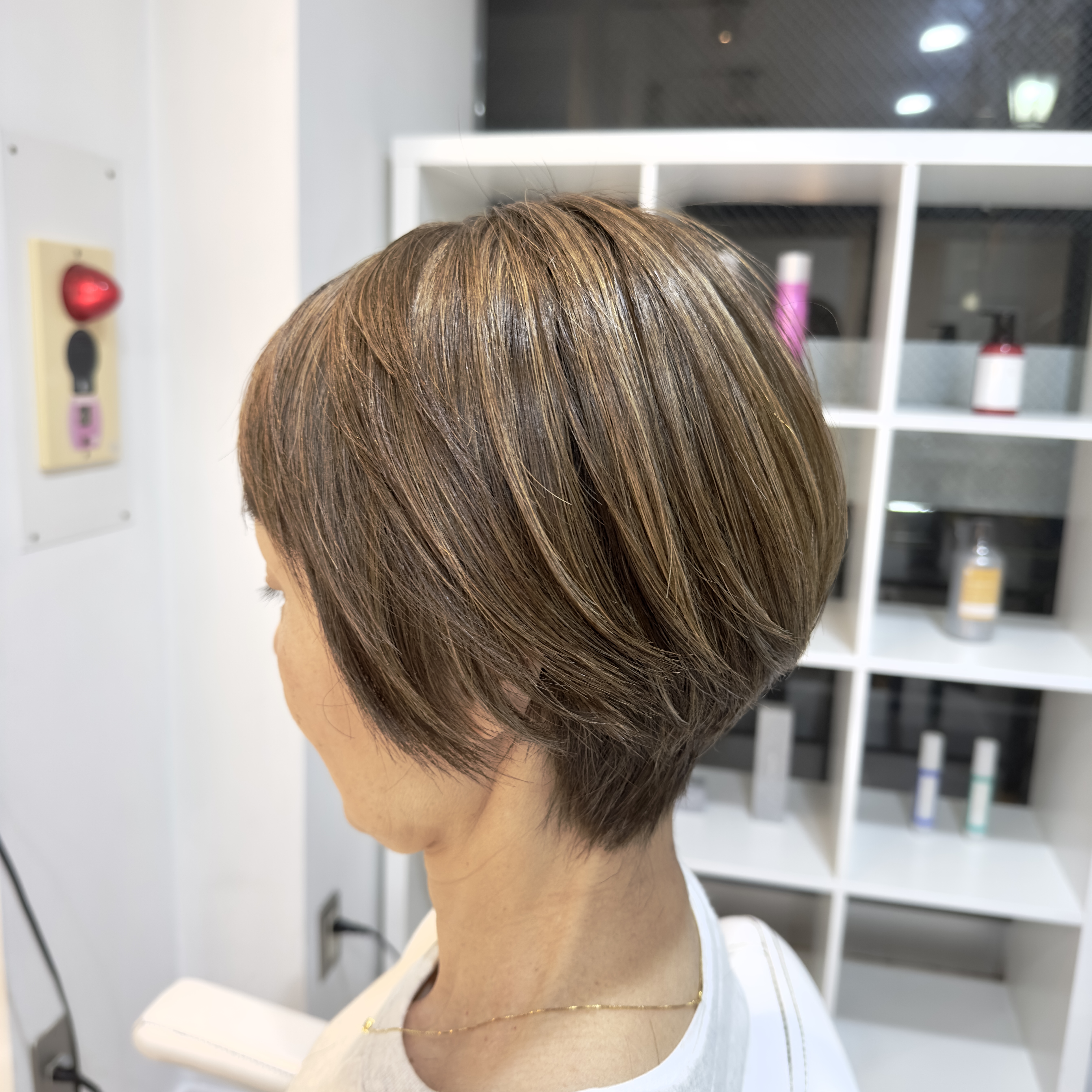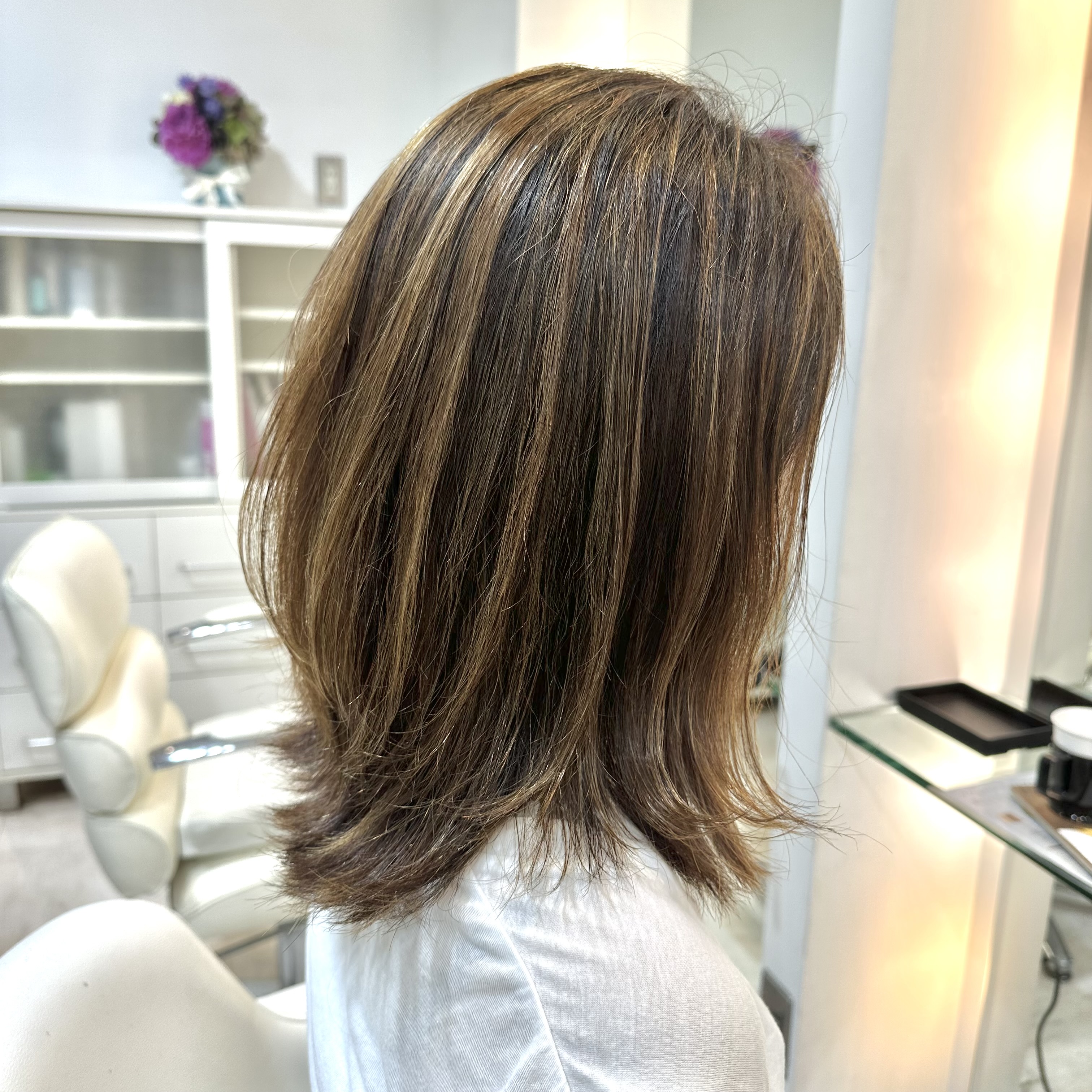 ハイライトの入れ方も独自のものとなっており、通常のハイライトよりもさらに細かく入れるため、仕上がりも自然で上品な仕上がりになります。